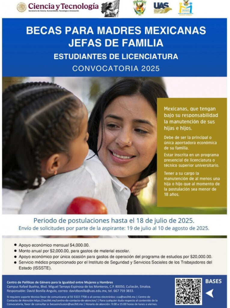 La Universidad Autónoma de Sinaloa (UAS) a través del Centro de Políticas de Género para la Igualdad entre Mujeres y Hombres (CPGIMH) convoca a mujeres estudiantes de licenciatura a que participen por las Becas para Madres Mexicanas Jefas de Familia 2025 que tengan bajo su responsabilidad la manutención de sus hijas e hijos.