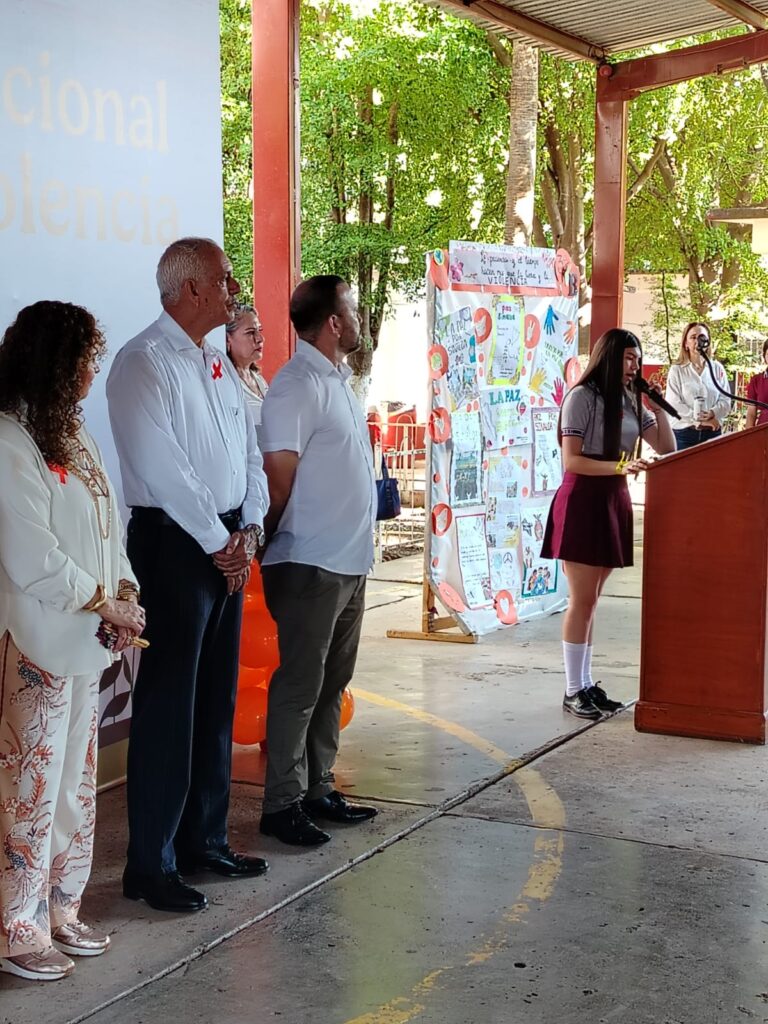 Posteriormente, en un diálogo directo con las y los estudiantes, la Secretaria de Educación, Gloria Himelda Félix Niebla, señaló que desde la Coordinación Académica de Básica y la Coordinación Estatal de Valores se trabaja en la implementación de diversas estrategias en las escuelas, para que nuestras niñas, niños, jóvenes y adolescentes convivan de manera armónica y cuenten con espacios escolares seguros y libres de violencia.