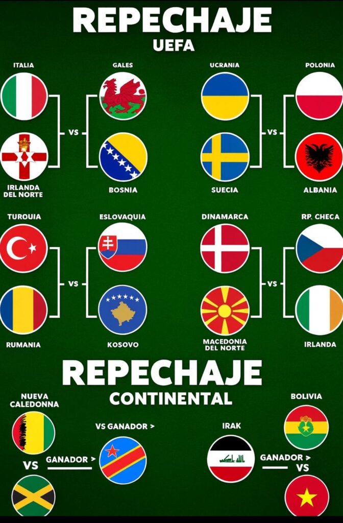 Los 12 segundos lugares de las eliminatorias de UEFA, junto a cuatro selecciones provenientes de la Nations League, quedaron distribuidos en un cuadro que contempla duelos directos sin ida y vuelta. Solo habrá semifinales y finales dentro de cada llave, todas programadas del 26 al 31 de marzo de 2026.