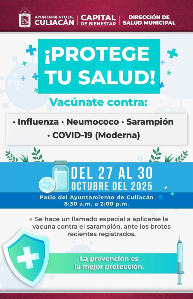 Culiacán, Sin., a 27 de octubre de 2025.- Con el propósito de fortalecer la salud de la ciudadanía, la Dirección de Salud Municipal inició la jornada ¡Protege tu salud!, con la aplicación de las vacunas contra el sarampión, influenza, neumococo y covid-19.