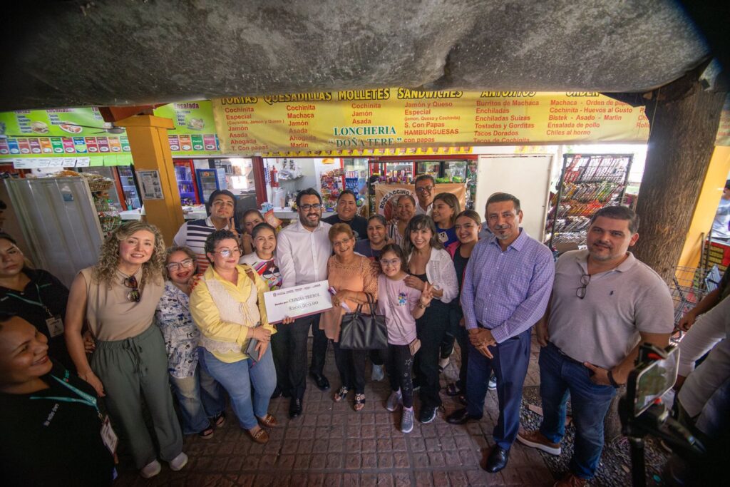Esta mañana, en el área de comida de la Facultad de Derecho de la Universidad Autónoma de Sinaloa, el alcalde entregó un cheque por 200 mil pesos a un grupo de trece mujeres denominado Chicas Trébol, conformado por emprendedoras de distintos giros comerciales.