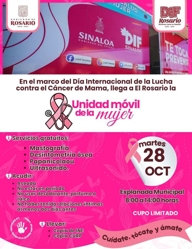 En el marco del Día Internacional de la Lucha contra el Cáncer de Mama, llegará al municipio de Rosario la Unidad Móvil de la Mujer para ofrecer servicios de salud gratuitos.