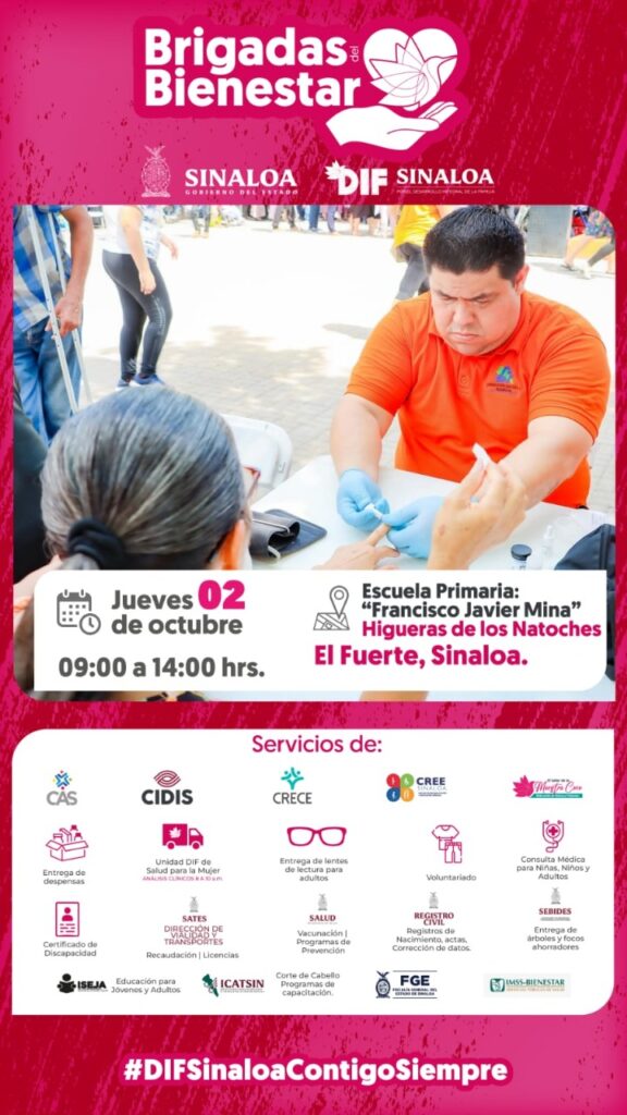Con el propósito de combatir las causas y los efectos de la vulnerabilidad, el sistema DIF Sinaloa llevará las Brigadas del Bienestar este jueves 02 de octubre de 9:00 de la mañana a 14:00 horas a la escuela Primaria Francisco Javier Mina.