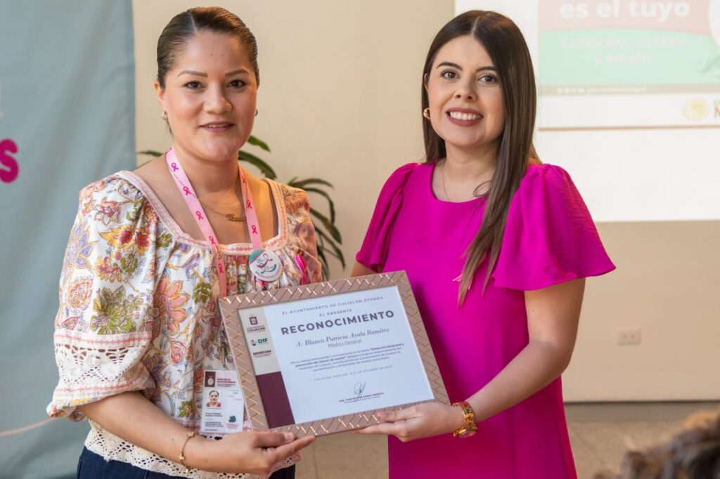 Al concluir la jornada, la presidenta del Sistema DIF Bienestar Culiacán, Irma Nidya Gasca Aldama, entregó un reconocimiento a la doctora Blanca Patricia Ayala, titular del Programa de Cáncer de la Mujer de la Secretaría de Salud del Estado.